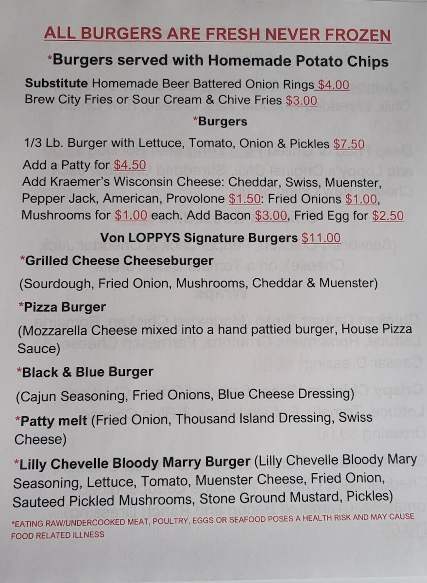 Von LOPPYS Bar & Bistro, located in Ixonia, WI, is a charming neighborhood eatery that welcomes all with a warm, unpretentious vibe. Known primarily for its excellent fish fry, the bistro also showcases hearty offerings like jumbo beef hot dogs and savory potato pancakes, receiving rave reviews from patrons. Guests appreciate the generous portions and the friendly service, making it an ideal spot for gatherings. Whether you're enjoying a classic Caesar salad or indulging in tasty appetizers like deep-fried mushrooms, Von LOPPYS promises a relaxed atmosphere complemented by affordable prices, ensuring every visit feels like a joyful celebration.